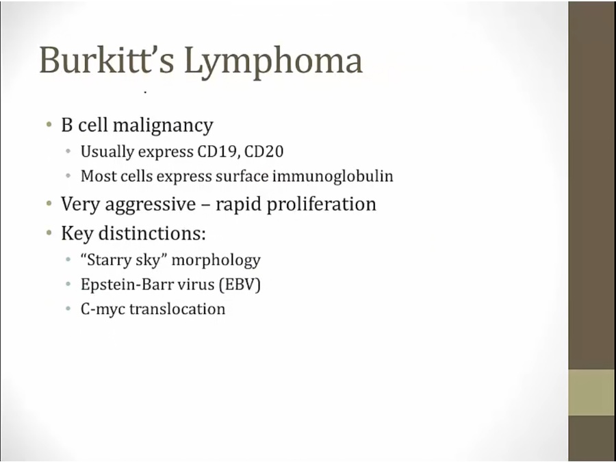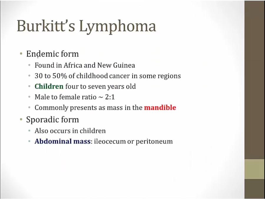 AA bar kid with swelling jaw: Endemic or African Burkitt lymphoma = large jaw lesion and swelling