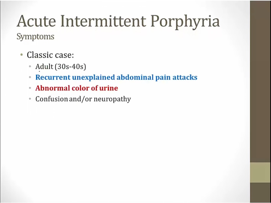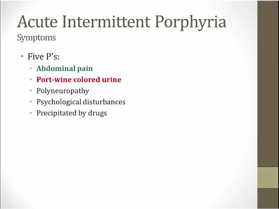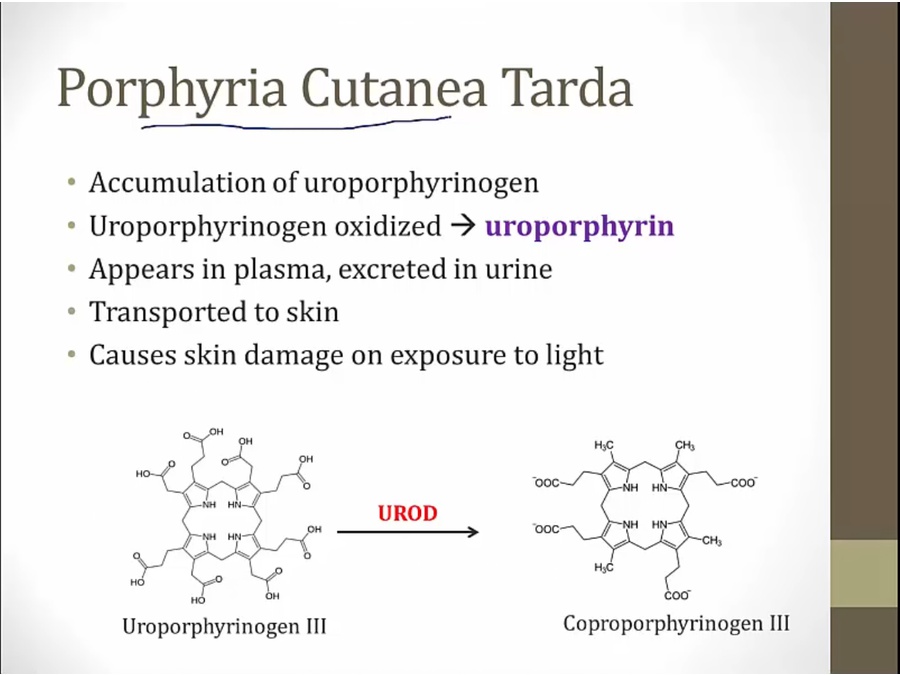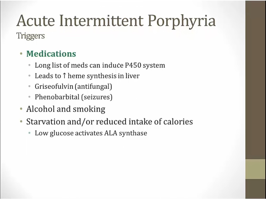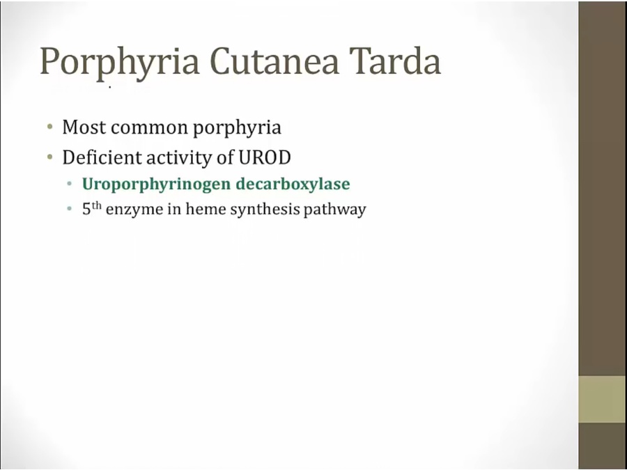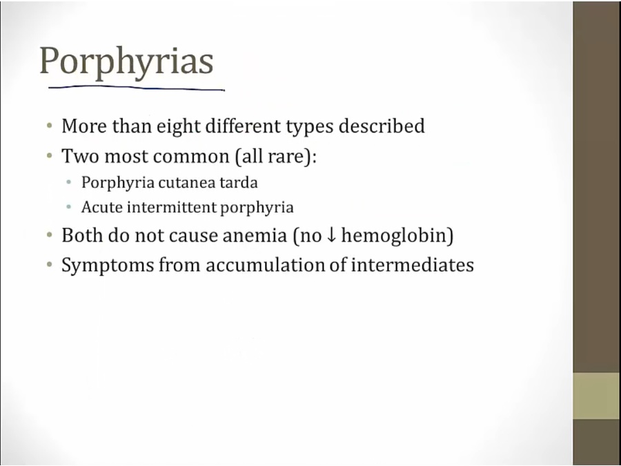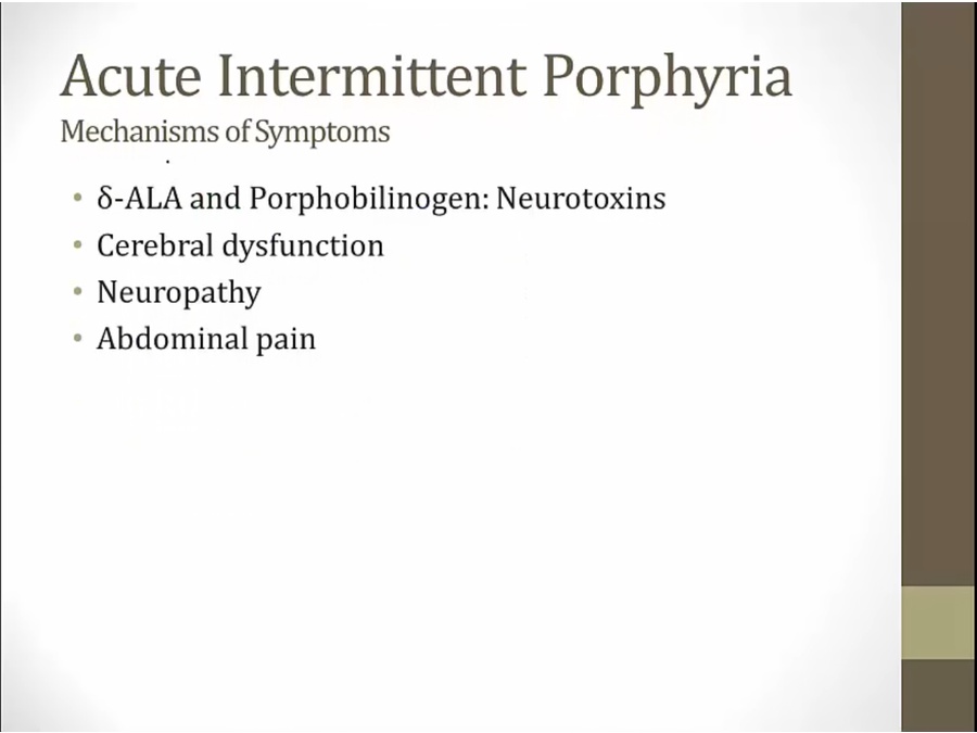 two common ones are hepatic porphyria: heme synthesis affected in liver