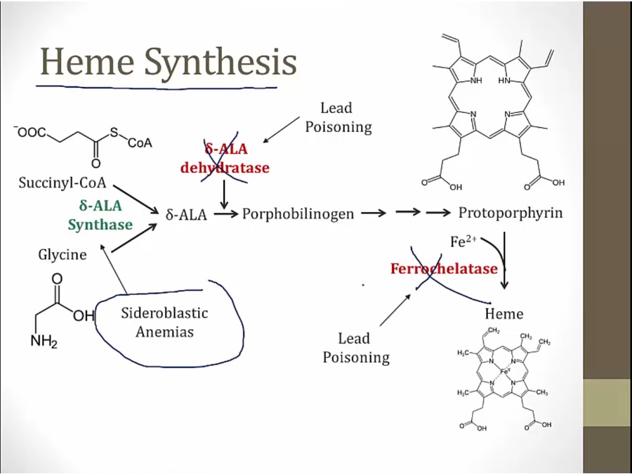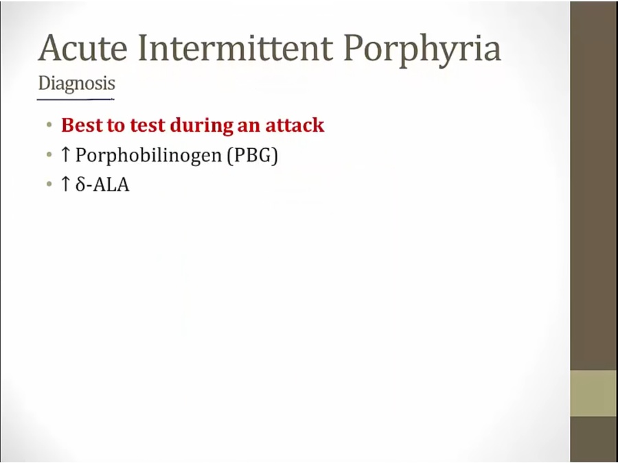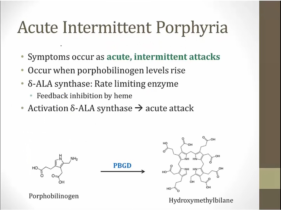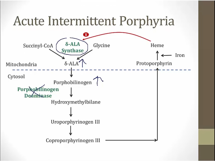 inhibited porphobilinogen deaminase and increased D ala synthase leads to increased D ala and porphobilinogen