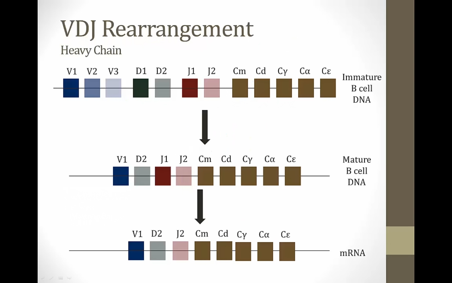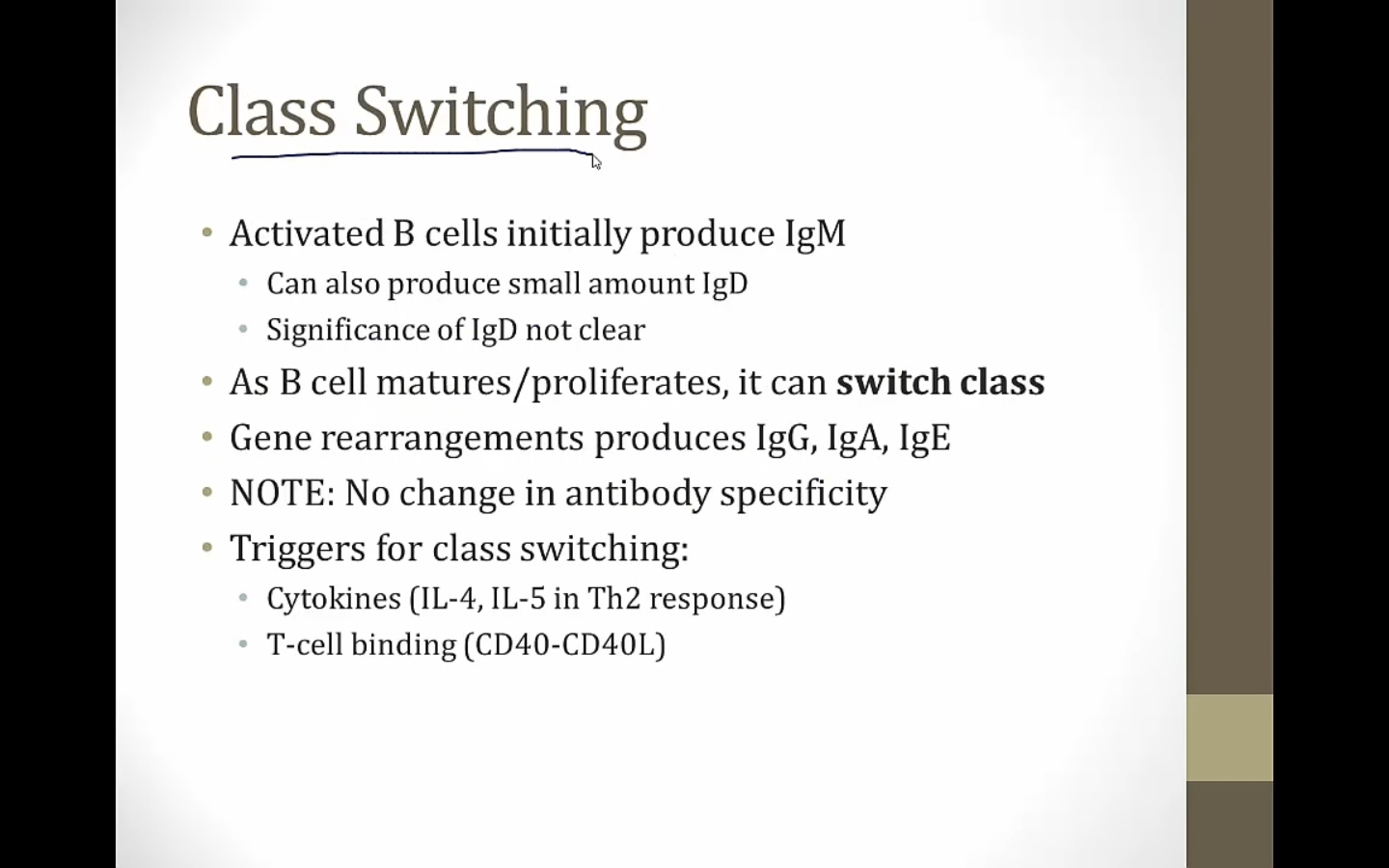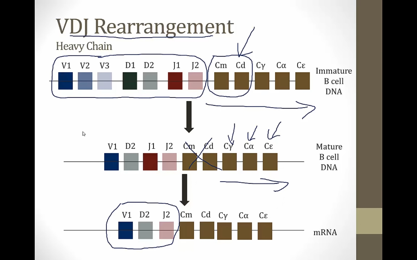 Cm and Cd spliced out; B starts to make Cy (IgG), Ca, Ce