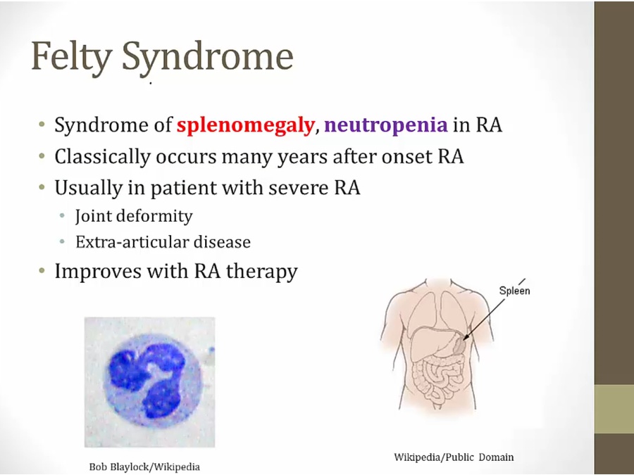 triad: splenomegaly, neutropenia, RA