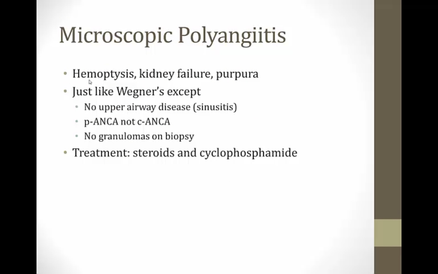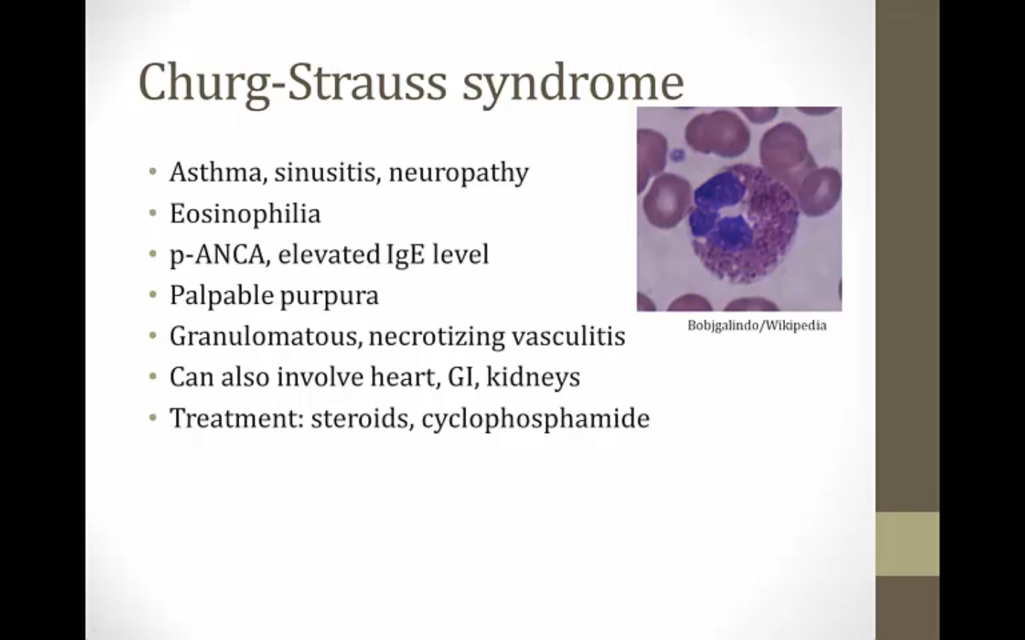 classic case: adult onset asthma with palpable purpura, eosinophila, p-ANCA