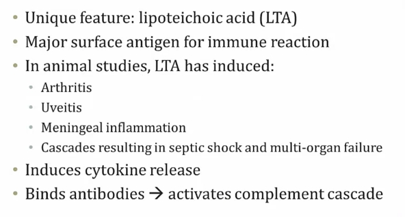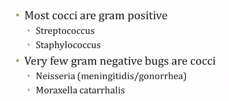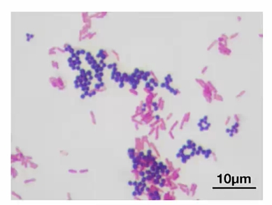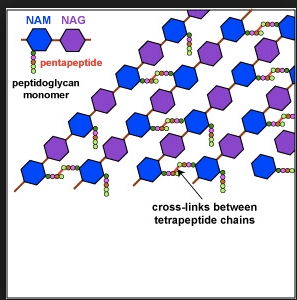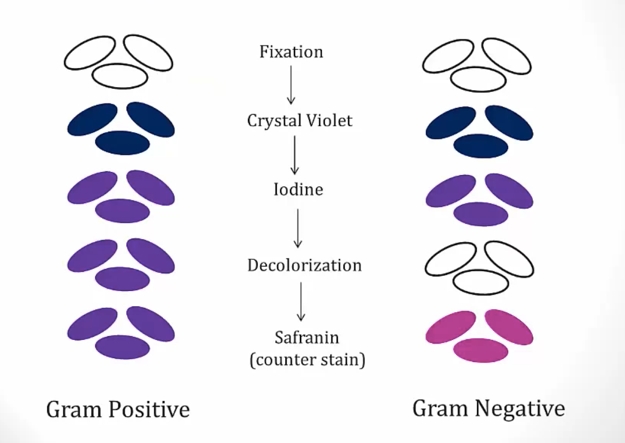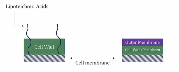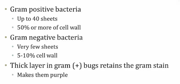 Gm +: thicker peptidoglycan cell wall, take up stain