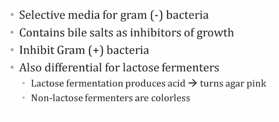 Eosin methylene blue: selective (gm-) and differential (lactose fermenting)