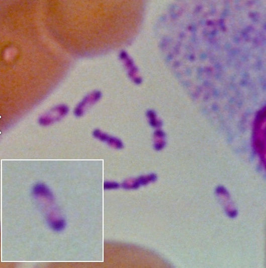 Safety pin: Bipolar staining, sometimes described as having a safety pin appearance