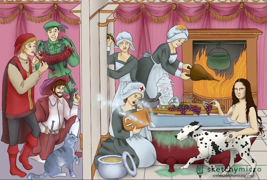 Maid listening with trumpet outside ear: Otitis externa. Swimmer's ear