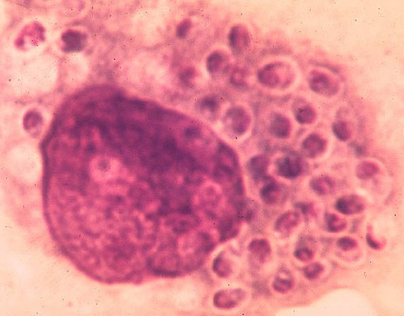 puddle: Macrophage with histoplasma inside, smaller than both RBC/macrophages