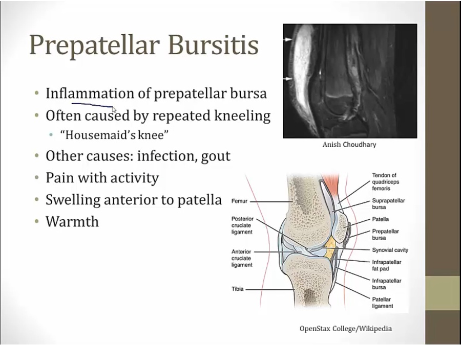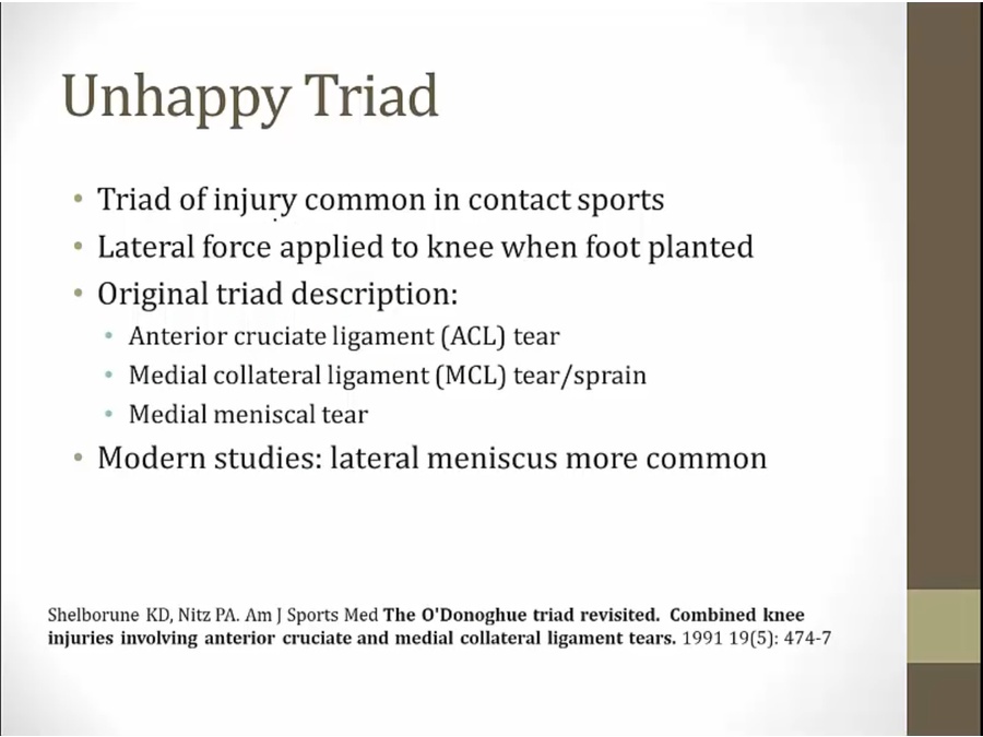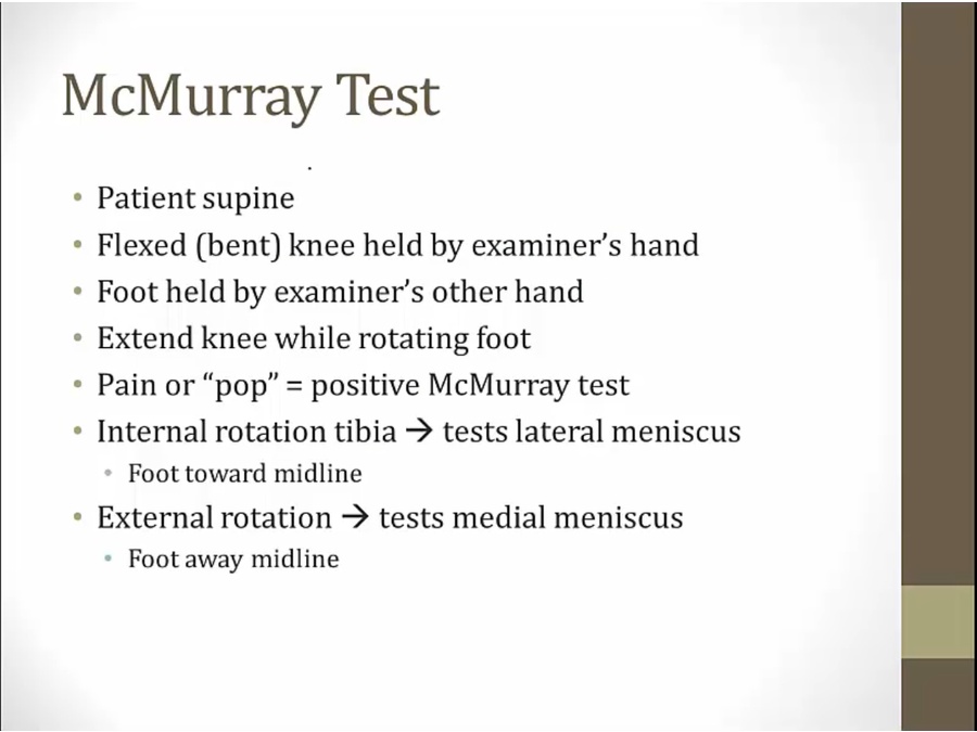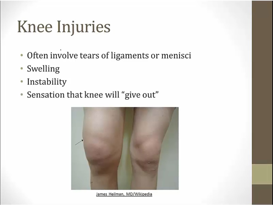 A meniscus injury typically shows a small joint effusion and crepitus, locking, or catching with range of motion.