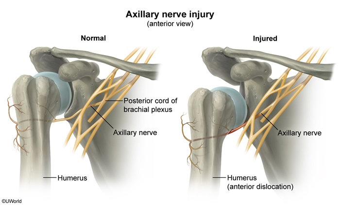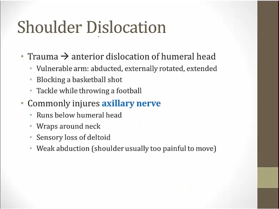 The shoulder may dislocate anteriorly, inferiorly, or posteriorly, but anterior dislocations are by far the most common. Anterior dislocations are typically caused by a blow to an externally rotated and abducted arm.