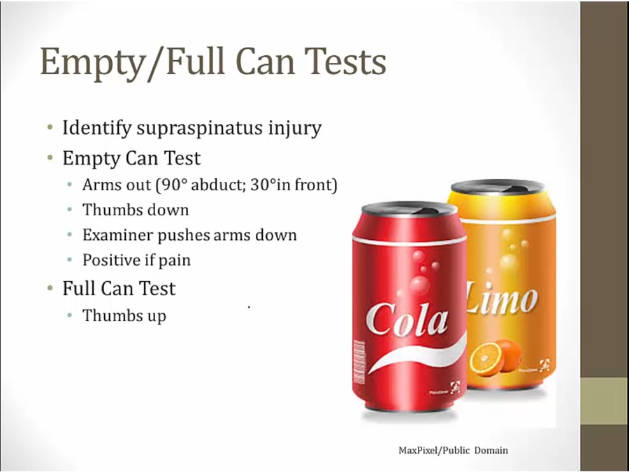 A complete supraspinatus tear causes weakness of abduction, which can be appreciated in the drop arm test. In this test, the patient's arm is abducted above the head and the patient is asked to lower the arm slowly. With a complete tear, the patient will be unable to lower the arm smoothly and it will drop rapidly around mid-adduction. Although the supraspinatus is the primary muscle responsible for initiating the first 15 degrees of abduction, the loss of smooth adduction in the drop arm test typically occurs when the humerus is near the horizontal plane. MRI can confirm the diagnosis, and treatment usually requires surgery.