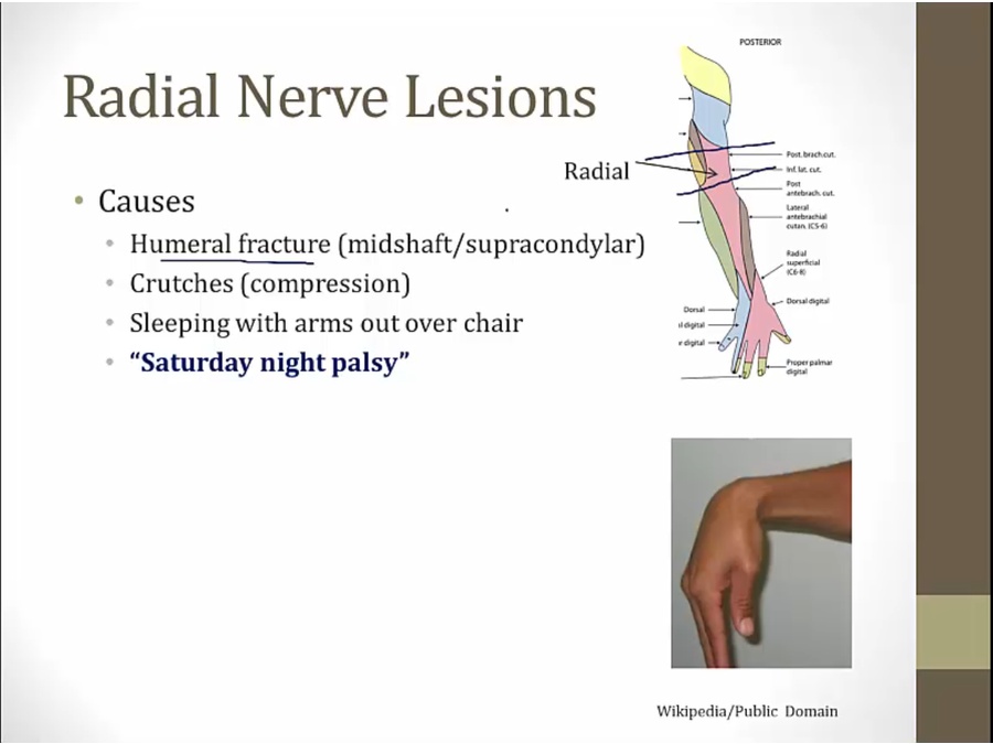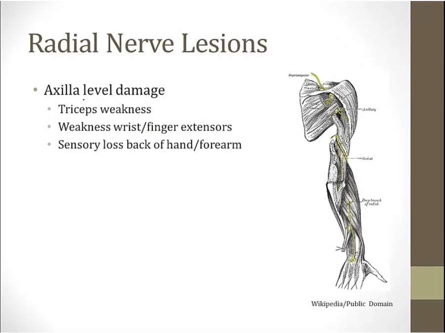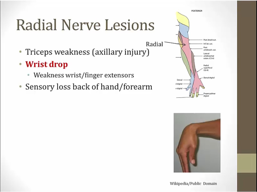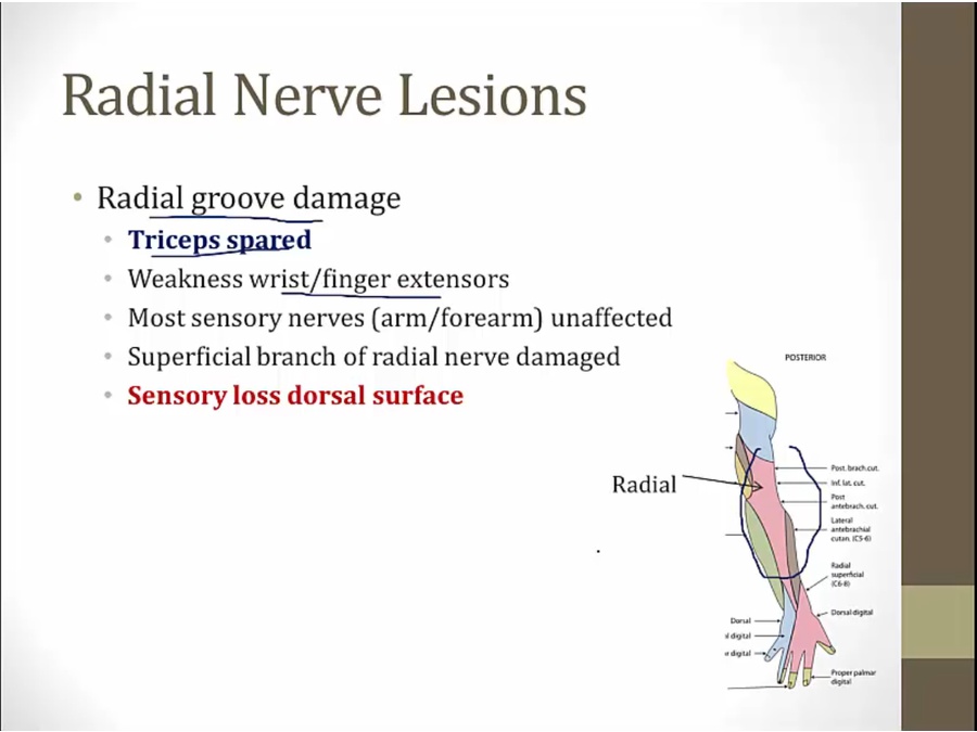 radial groove damage: normally extension of elbow, loss of extension of wrist/finger, normal sensation of back arm