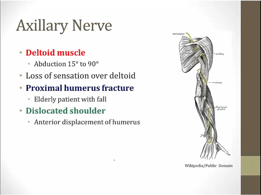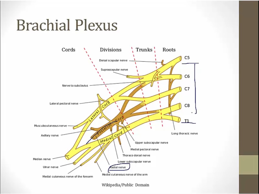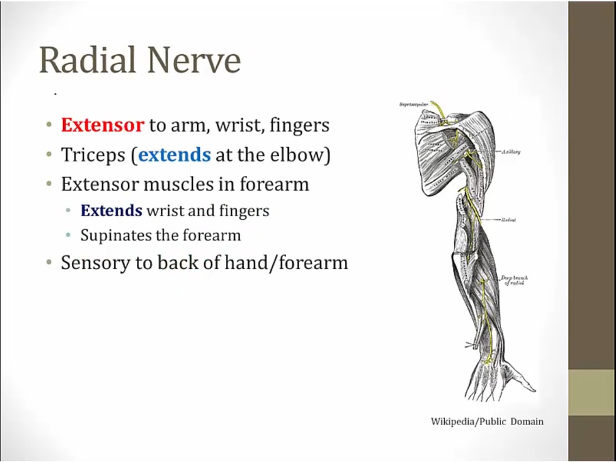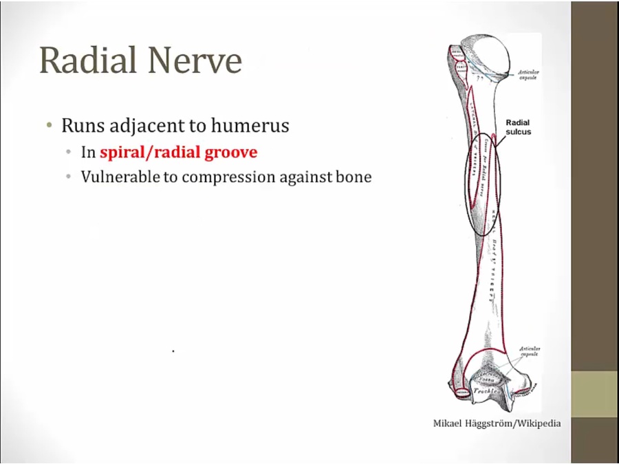 wraps around humerus, innervates muscles in back of forearm