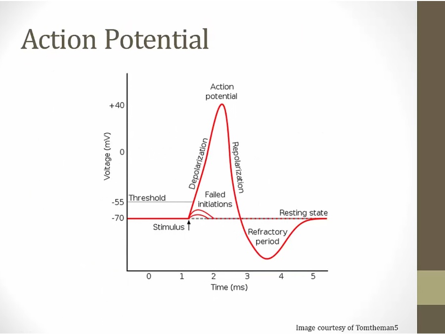 depolarize: Na open, raise voltage. More channels open down the axon