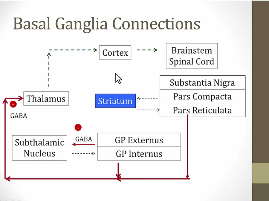striatum stimulated and inhibit GP externus, thus disinhibit subthalamic nucleus that stimulates GP internus that inhibits thalamus