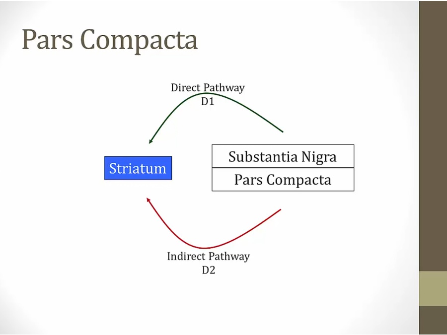 cortex also stimulates pars compacta that inhibits striatum via D2