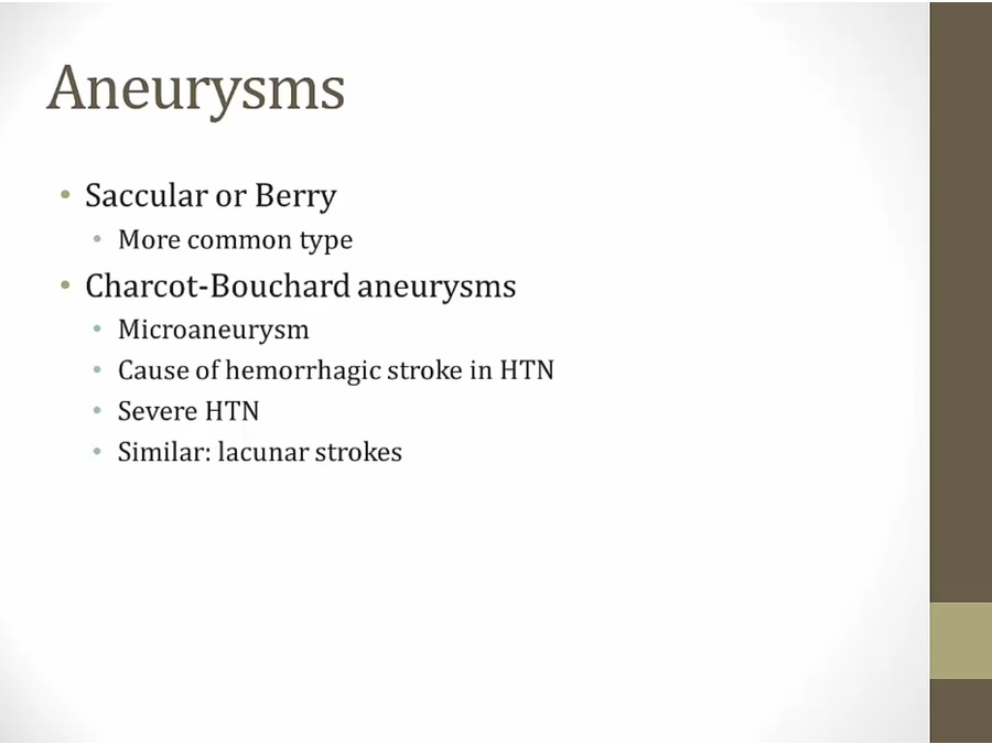 lacunar stroke: obstruction of small vessels, rupture = charcot
