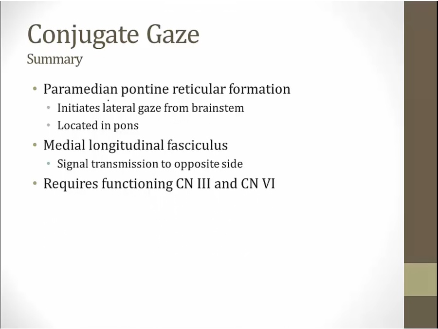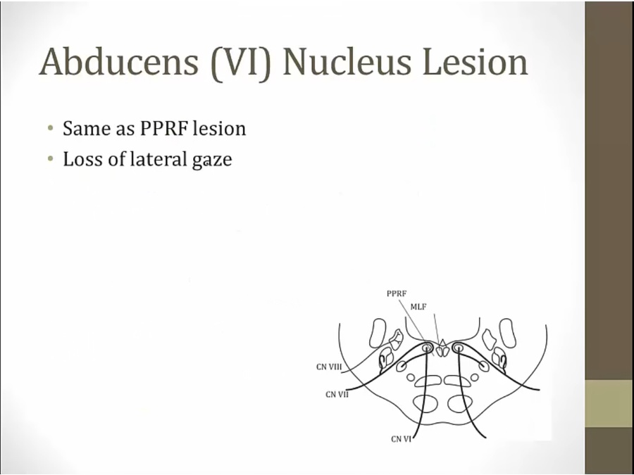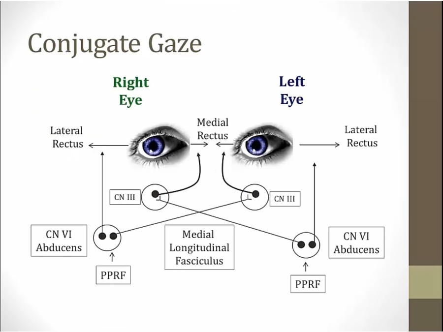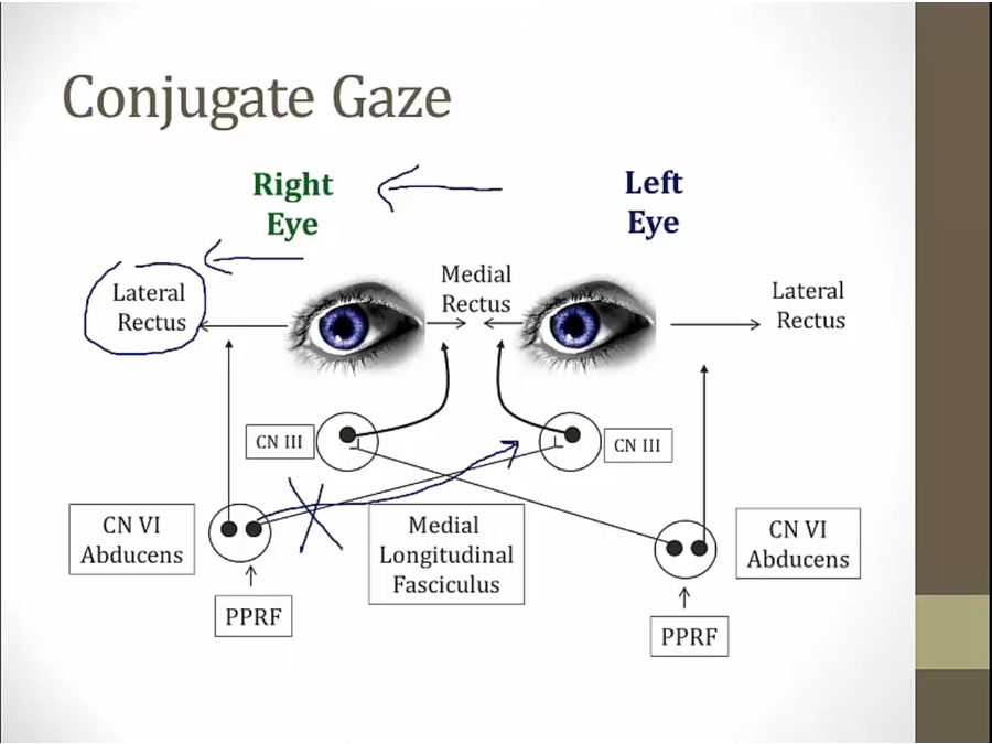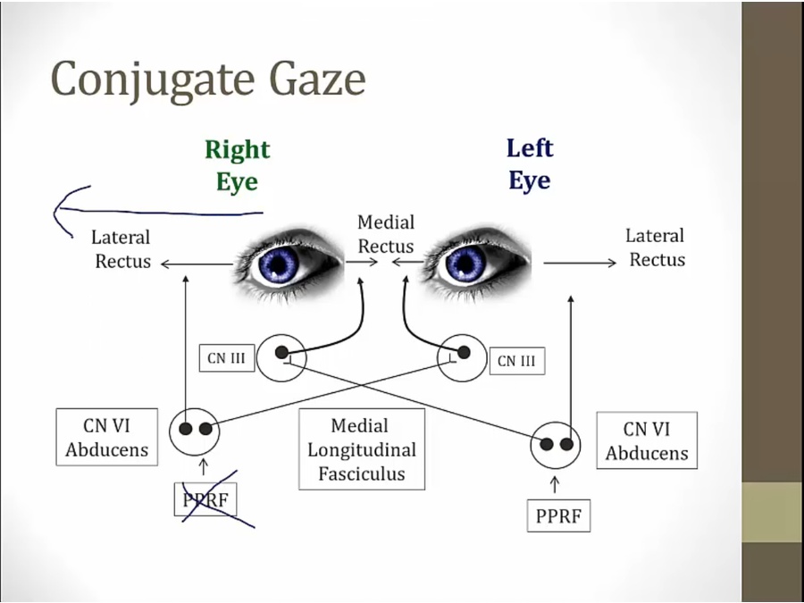 look to right: begin in PPRF signal to CN 6 nucleus, innervate LR