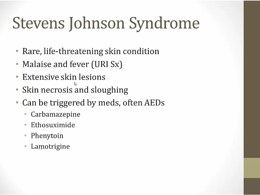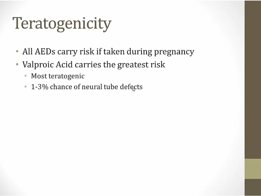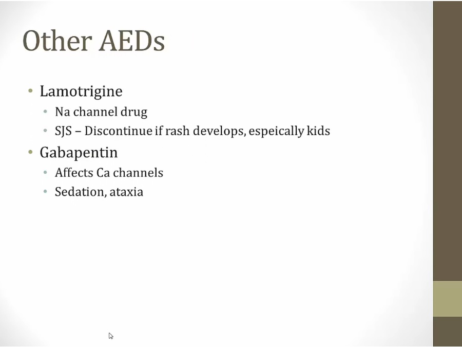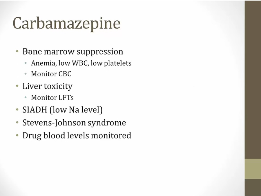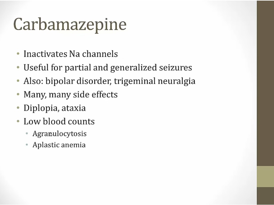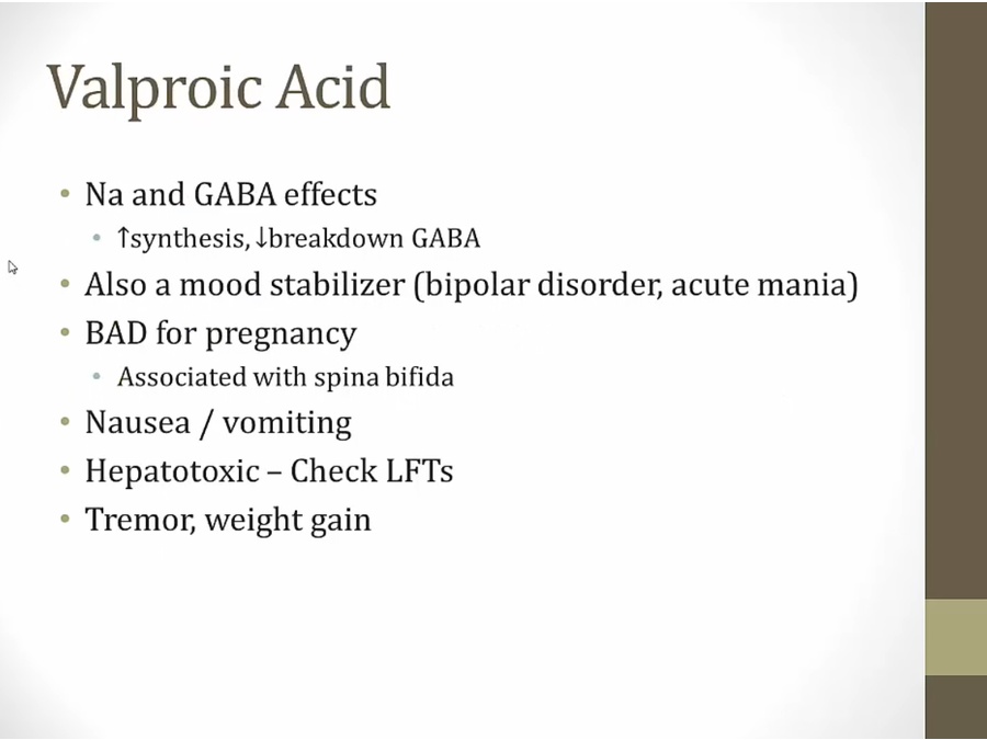 Topiramate: also migraine drug, causes foggy mind, more Ca in urine = stones