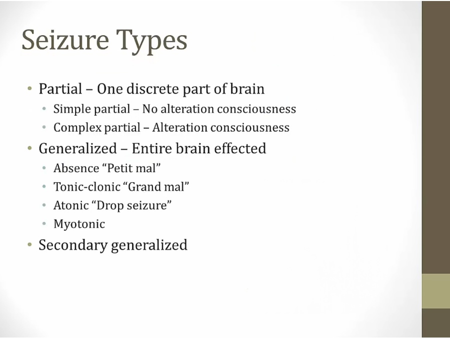 petit mal: common in children, loss awareness of surroundings briefly