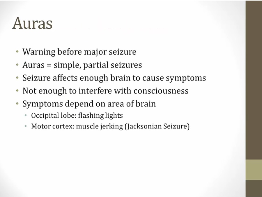 .  - muscles can contract, relax, spasm - feel, see, smell things not there - mild: loss of awareness for a few minutes, aka absence seizures - severe: pt collapse and shakes   - classic: epigastric rising, precede temporal lobe epilepsy - piloerection: skin standing on edge