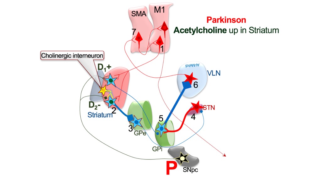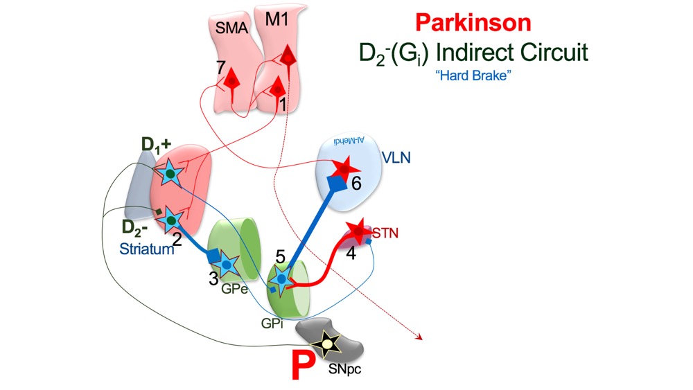 Loss of caudate, loss of GABA, no inhibition = breakthrough of movement. Indirect pathway