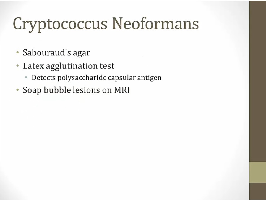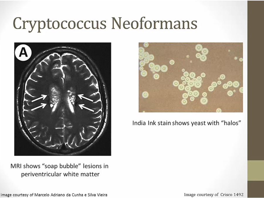 soap bubbles on head: Causes "soap bubble" lesions in gray matter