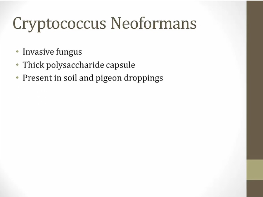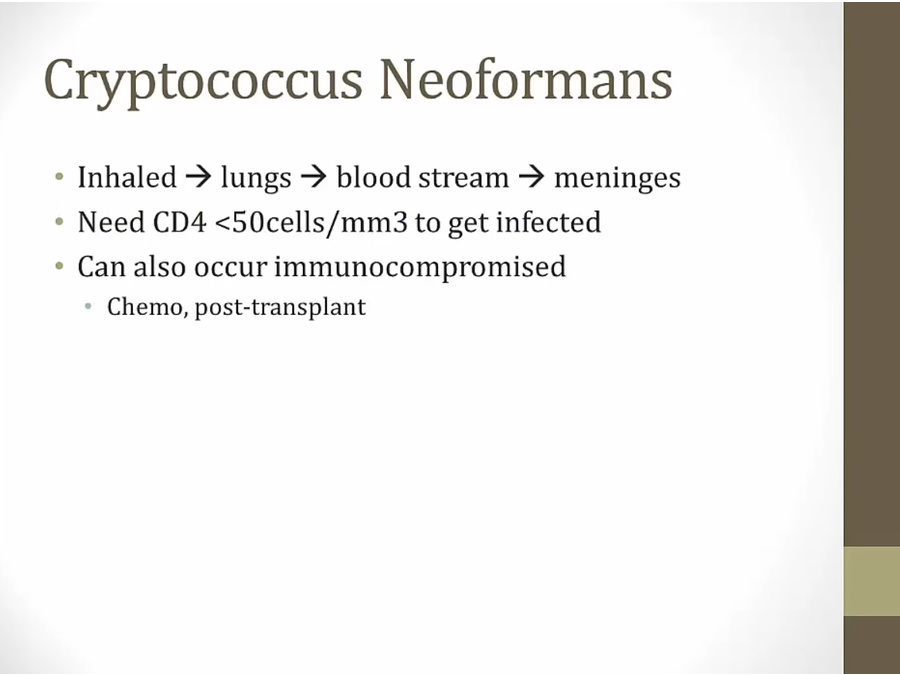 pigeons with droppings. Archaeologists coughing: Cryptococcus is inhaled from soil and/or pigeon droppings. Settles in lungs