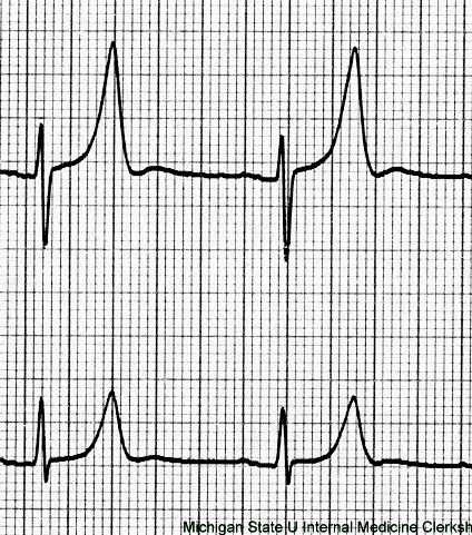 Peaked streamer: hyperkalemia can cause peaked T waves (with shortened QT interval) on ECG