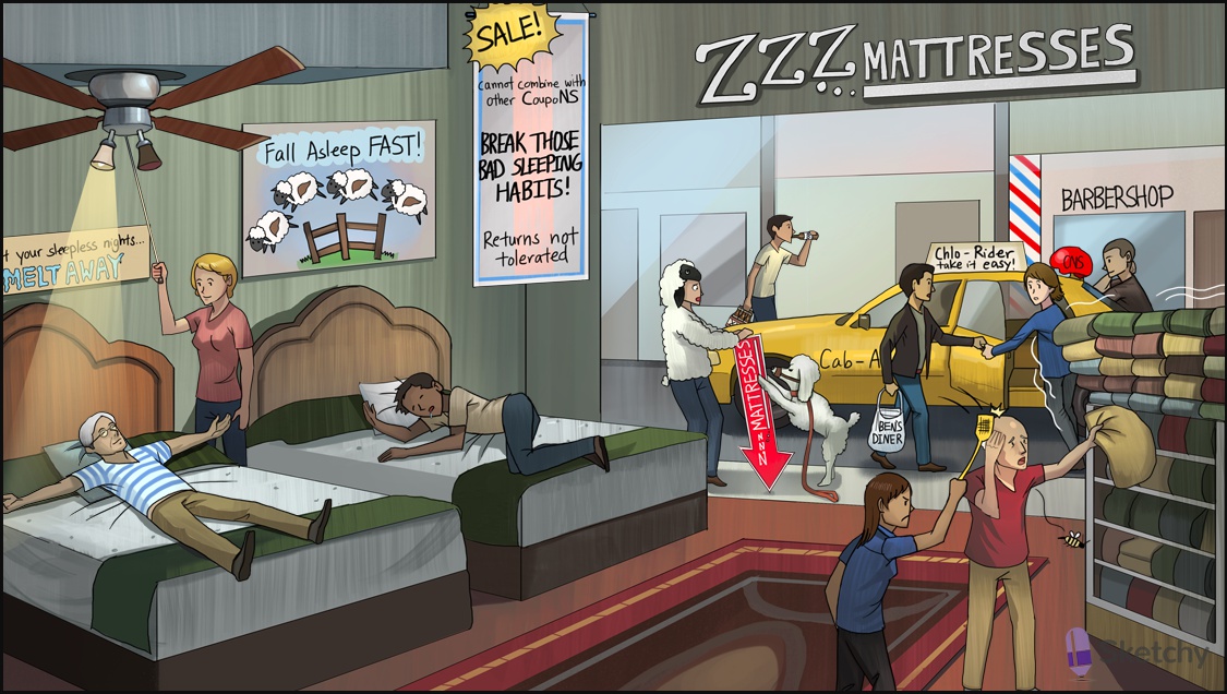 Sleeping customer: benzodiazepines treat insomnia (not first line due to side effect of physical dependence)