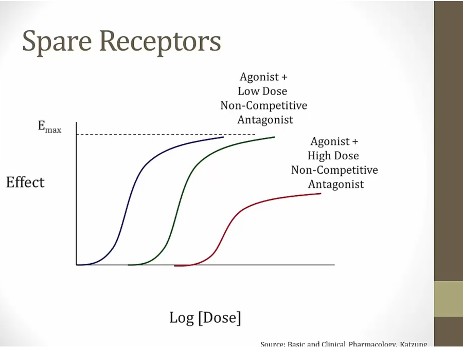 eventually with high dose noncompetitive antagonist, lower Emax, antagonize also spare receptors