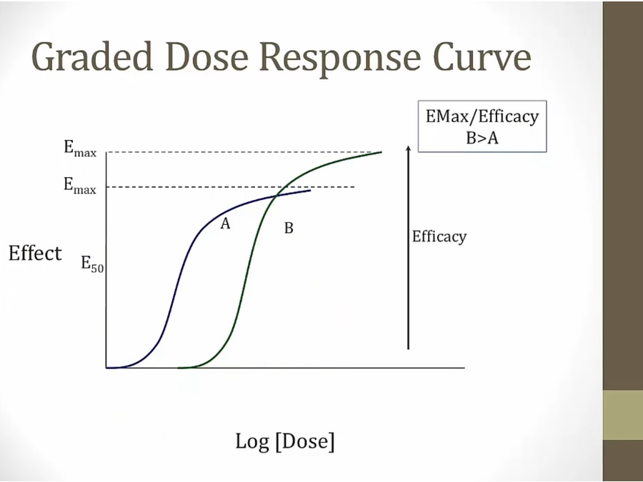 EC50 or ED50: effective concentration or dosage. Dose needed to get 50% Emax
