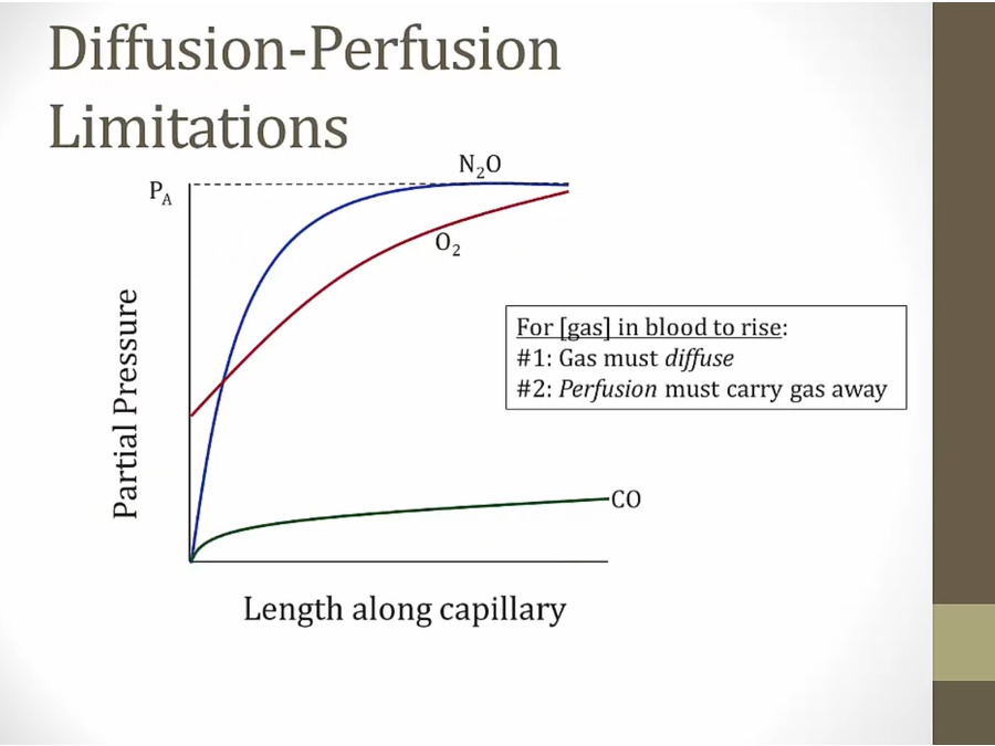 N2O: at length 0, no N2O diffuse into blood; diffusion rises very rapidly along capillary length to max value