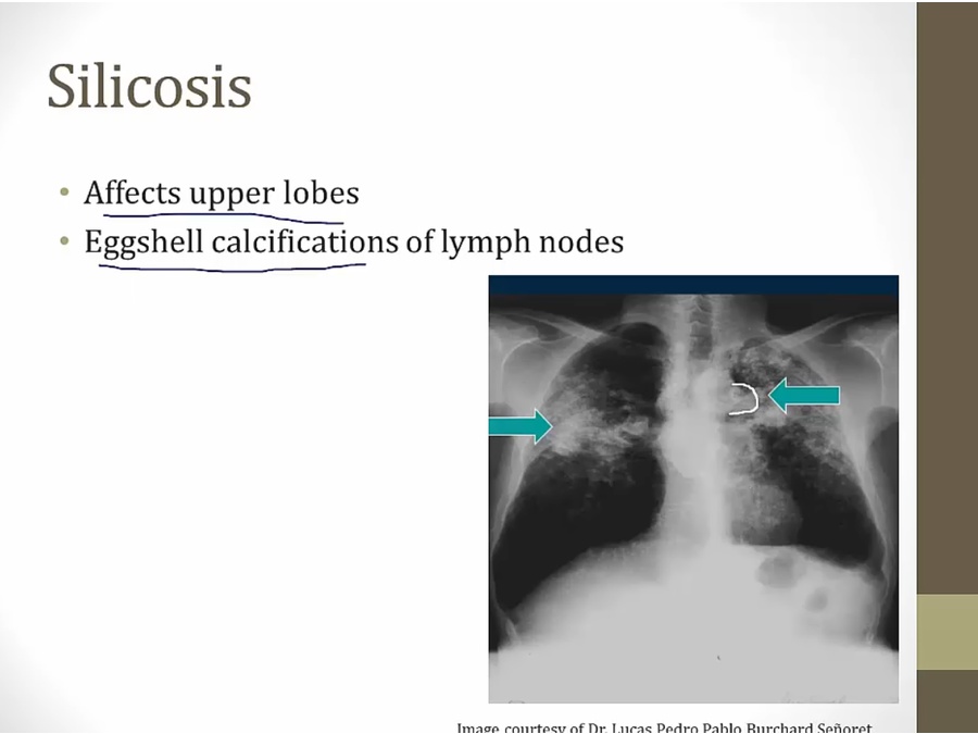 Silicosis is distinguished by calcification of the rim of hilar nodes (eggshell calcification) and birefringent silica particles surrounded by fibrous tissue on histology. It has long been associated with increased risk of tuberculosis.