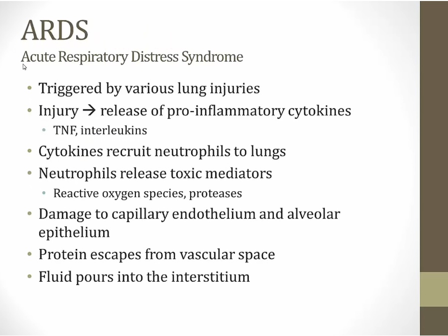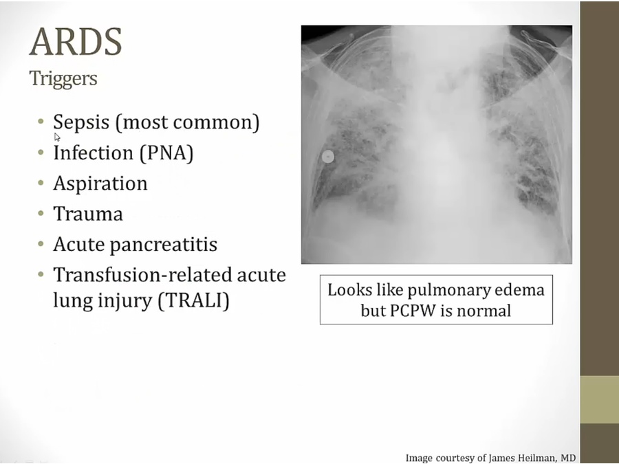 same problem as pulmonary edema in HF but leaky vasculature instead of hydrostatic pressure