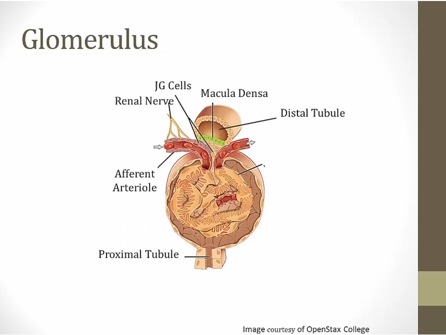 JG (juxto glomerulus): modified smooth muscle cells of afferent arteriole. Sits between afferent/efferent, distal tubule and glomerulus
