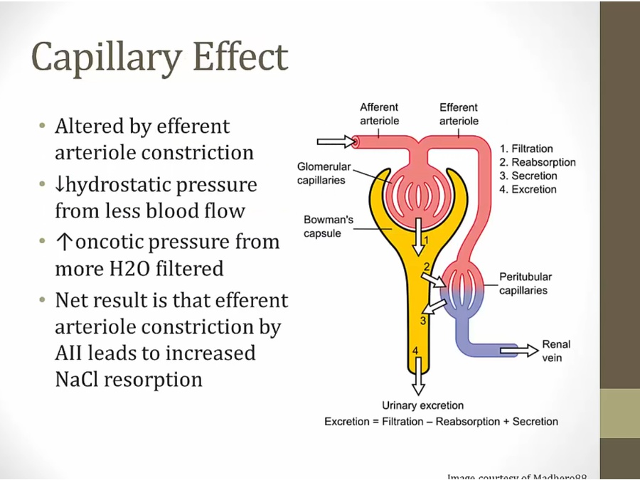 less fluid go to peritubular because of constriction