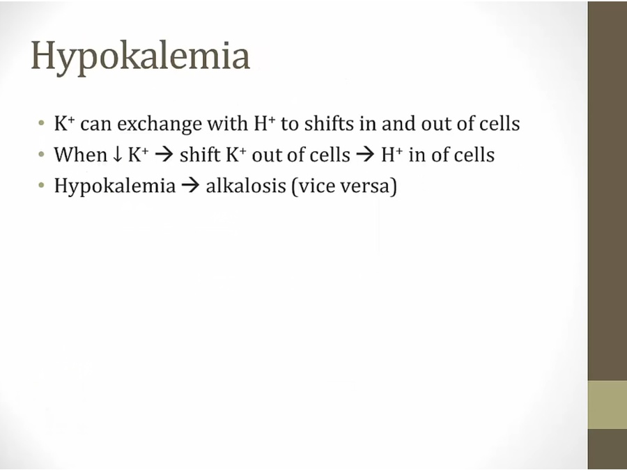 low K in blood, K shift out of cells in exchange to H in, alkalosis