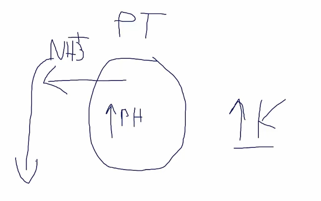 hyperkalemia > increased K into cell, increased H out of cell> high pH in PCT cells