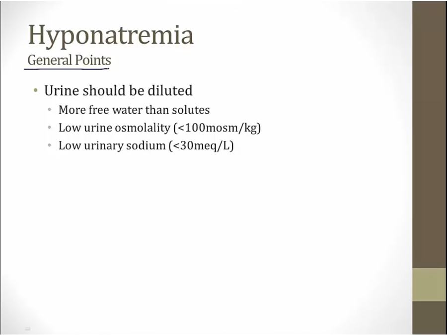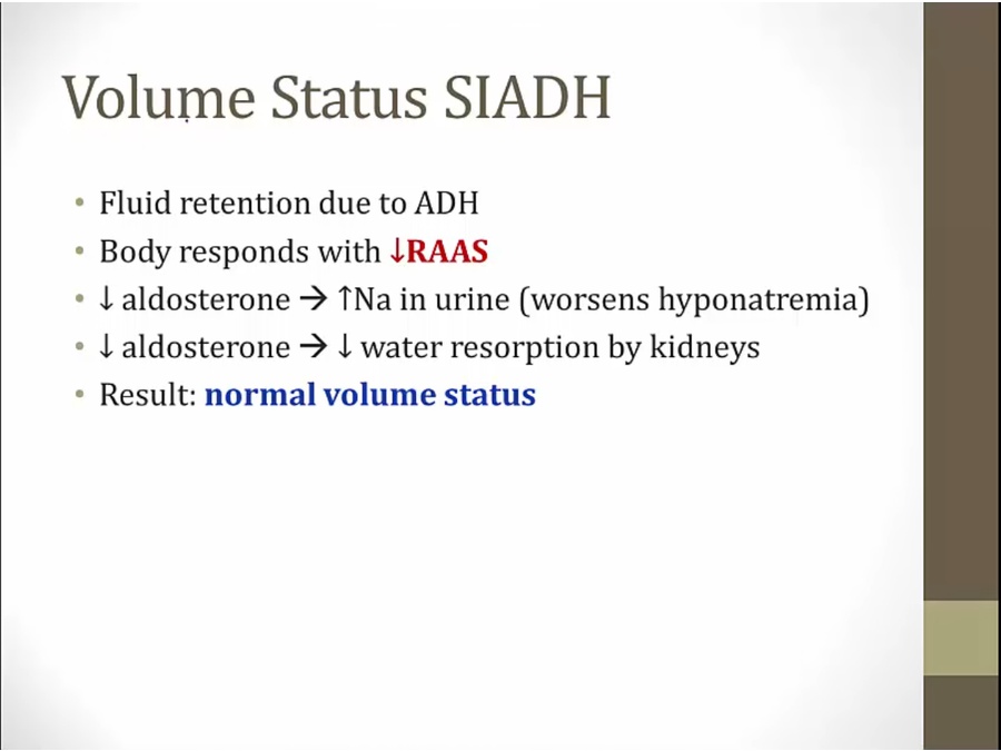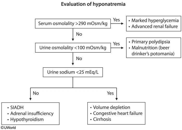 Patients with SIADH are typically euvolemic; therefore, urine sodium concentration is typically elevated (>40 mEq/L), unlike in patients with hypovolemia.