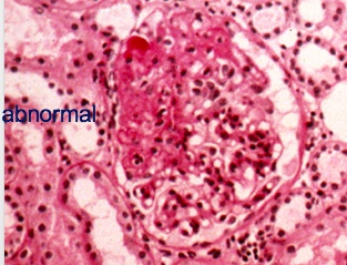 image: normal upright, abnormal lower left; pink deposition in abnormal