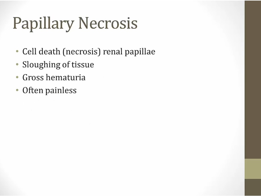 Symptoms are due to sloughed papillae (sometimes visible in urine as tissue flecks) and include dark or bloody urine and colicky flank pain (due to ureteral obstruction).