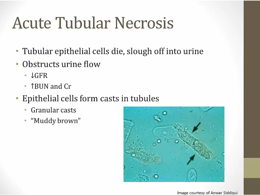 Rusty downspout draining muddy water: acute tubular necrosis (ATN)