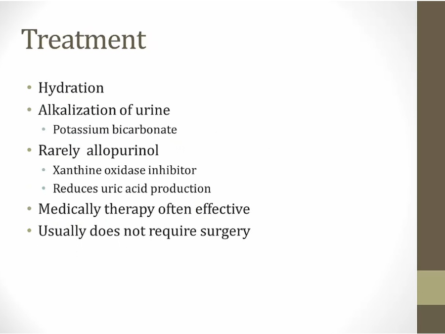 Patients with suspected cystinuria without cystine crystals on urinalysis can be diagnosed by detecting elevated urinary cysteine levels (ie, aminoaciduria). The sodium cyanide-nitroprusside test is a qualitive screening test that detects the presence of urinary cystine. Cyanide is initially added to the urine, converting cystine to cysteine. Afterward, nitroprusside is added and reacts with the sulfhydryl group on free cysteine, causing a red-purple discoloration (positive test). Treatment of cystinuria involves increasing hydration and urinary alkalinization (eg, acetazolamide).