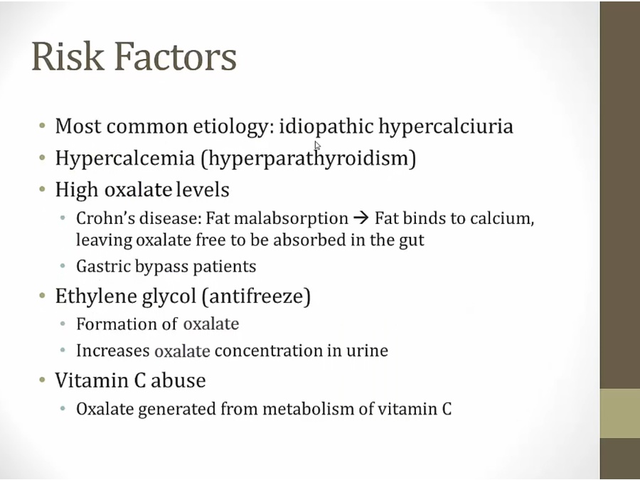 Crohn's: Under normal circumstances, calcium binds oxalate in the gut and prevents its absorption. In patients with fat malabsorption, calcium is preferentially bound by fat leaving oxalate unbound and free to be absorbed into the bloodstream. Failure to adequately absorb bile salts in states of fat malabsorption also cause decreased bile salt reabsorption in the small intestine.