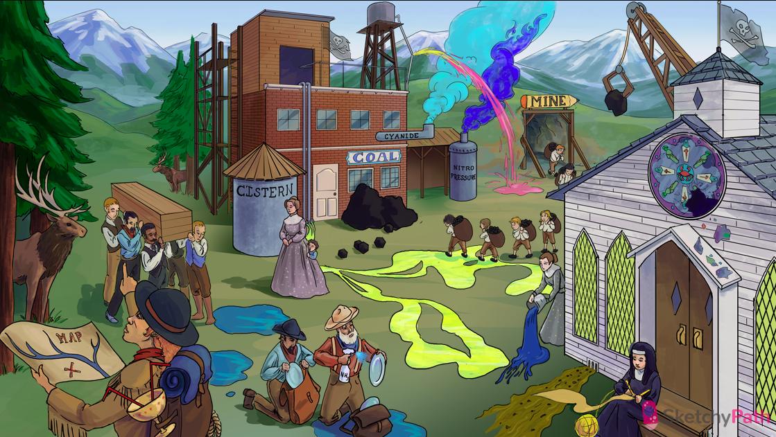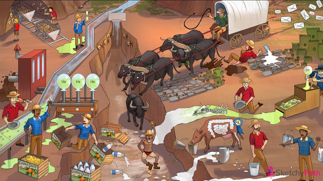 Acid miner grabbing citrus crate: acidemia promotes resorption of citrate from tubule → less citrate bound to calcium in tubule → calcium stones