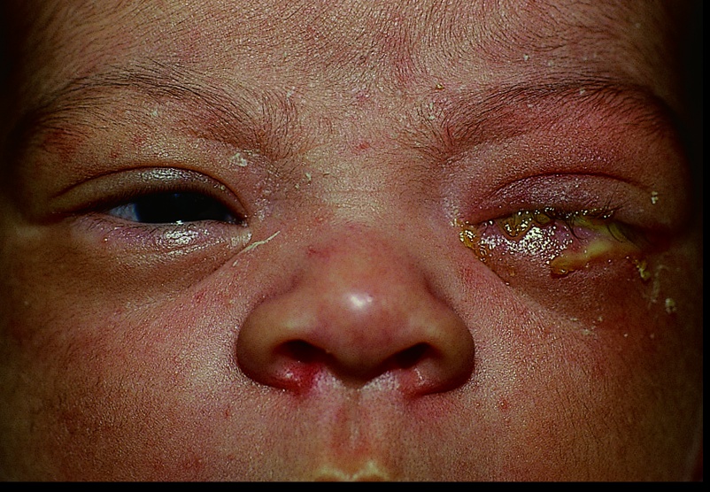 Neonatal conjunctivitis. Twelve-day-old with 5-day history of progressive lid swelling and discharge typical of chlamydial conjunctivitis.: