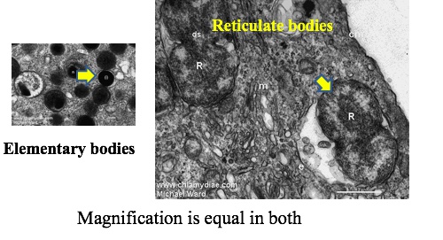 Pearls: elementary bodies (enter); Clams: reticulte bodies: binary fission and replicate