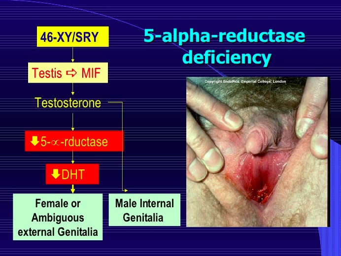 _An autosomal recessive disorder resulting in an inability to convert testosterone to dihydrotestosterone (DHT).,