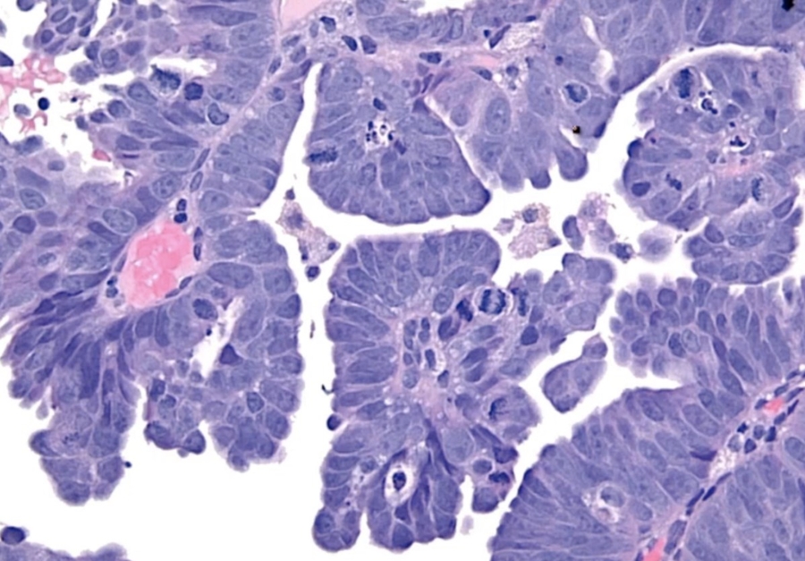 Sporadic pathway (25% of cases): carcinoma arises in an atrophic endometrium. There is no evident precursor lesion. Average age is 70 years. Histology is usually serous and is characterized by papillary structures with psammoma body formation. It is commonly driven by a p53 mutation, and the tumor exhibits aggressive behavior. (Necrosis > calcification > psamomma body)