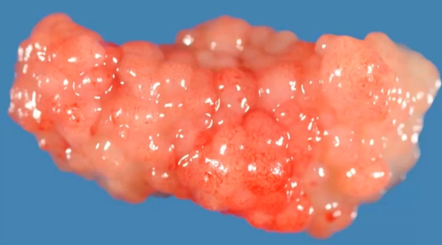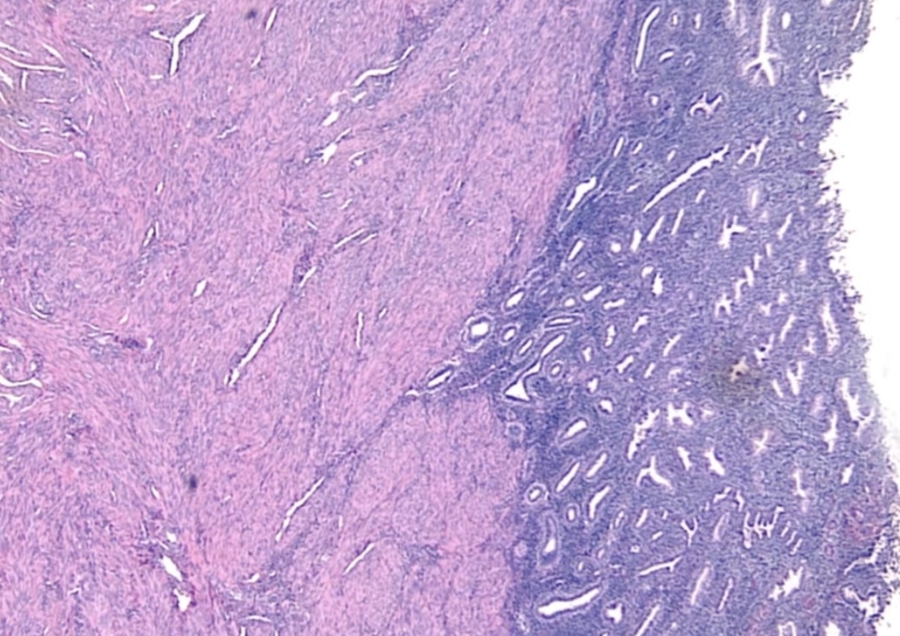 _It often presents with multiple discrete tumors that are well-demarcated (i.e., encapsulated) by a pseudocapsule. No necrosis or hemorrhage Uterine cavity in middle: